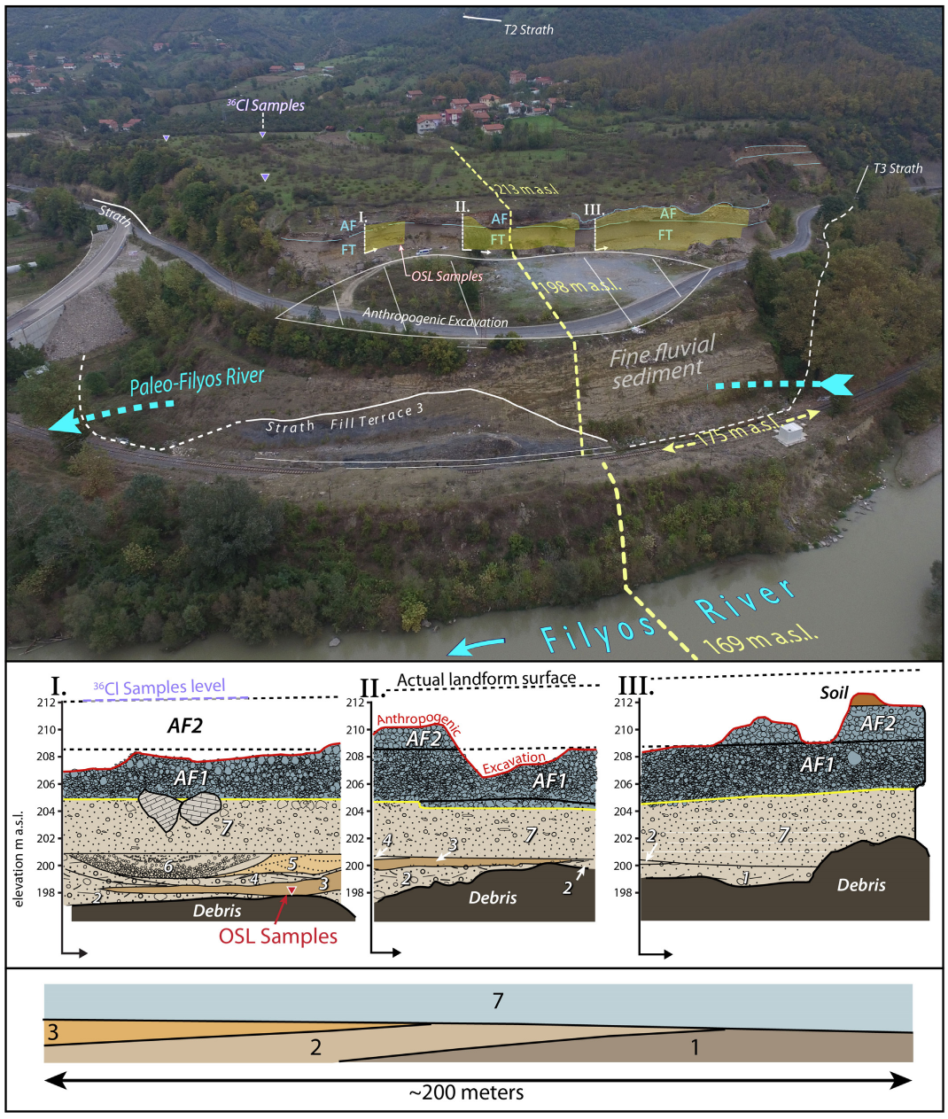 UAV view of the junction terrace, which is part of T3, the lowest terrace level (top). Sample locations are labeled, the bedrock strath is marked in white, and the horizon between fluvial and alluvial fan layers is marked on the outcrop. Y-axes I, II, and III are marked at their locations and represent the axes in the middle illustration. Illustration of exposed alluvial and fluvial sediments in three sections (middle). Simplified illustration of the orientation of layers 1, 2, 3, and 7, which correspond to the progradation of a longitudinal bar (bottom).