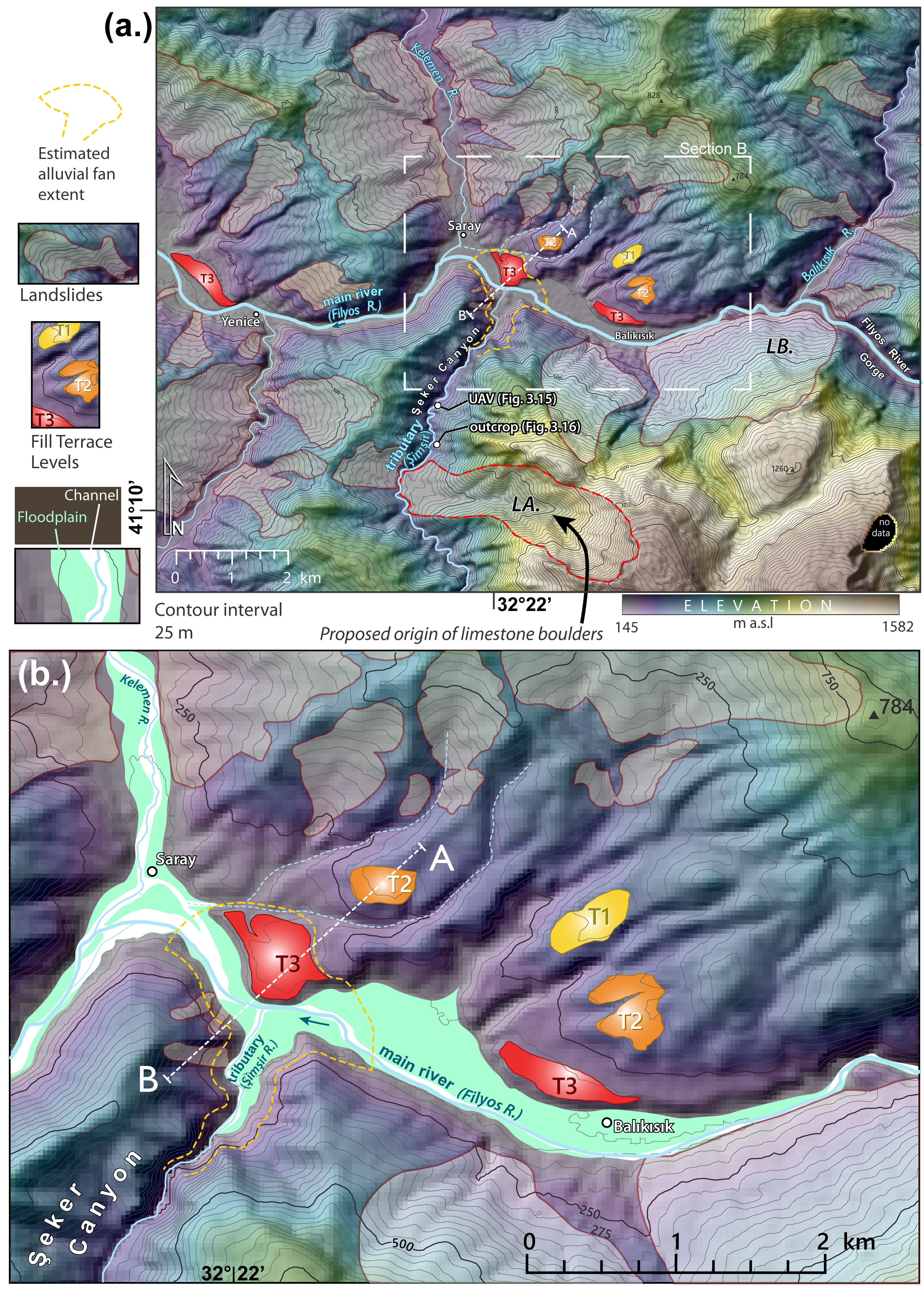 Topographic map downstream from the Filyos River Gorge, showing the locations of fluvial terraces, landslides, possible extent of proposed alluvial fan, and Figs. 9 and 10 photo locations (a.). The main river (Filyos) flows westward and the tributary of interest (Şimşir) flows northward. A closer view of the floodplain area and tributary junction is mapped below (b.). The A-B topographic profile of Fig. 11 is depicted with a white dashed line. Landslides marked LA. and LB. are discussed in this paper as are the dashed intermittent channels adjacent to T2.
