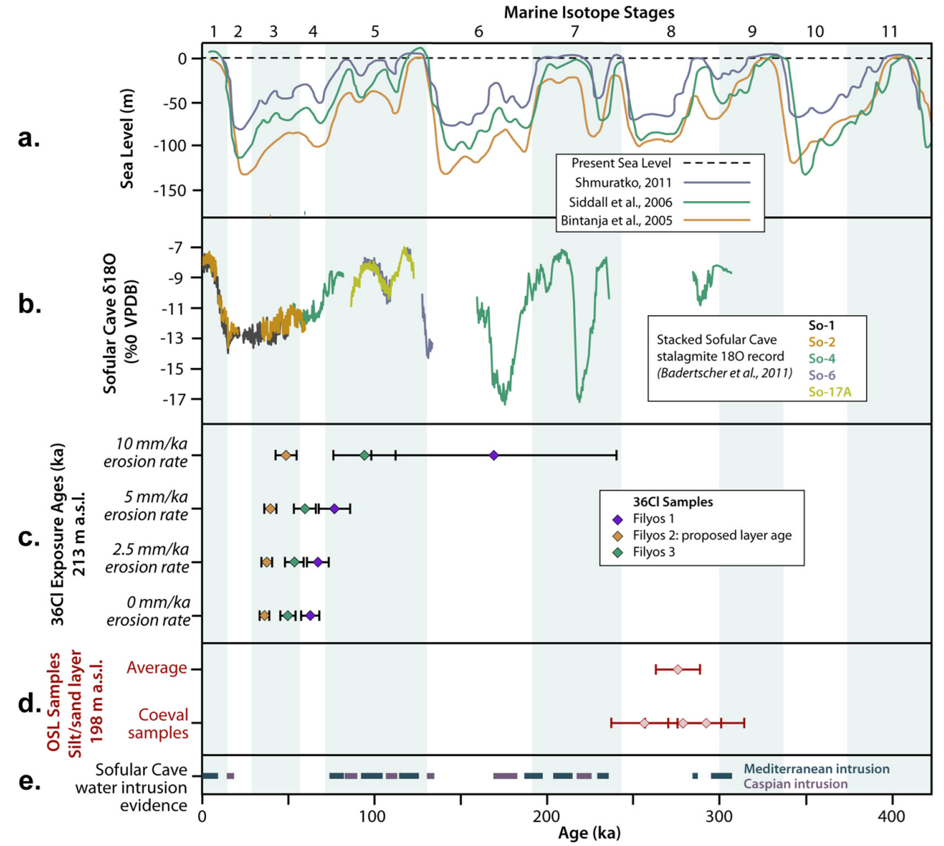 Sea level curves from MIS 11 through present, modified from Yıldırım et al. (2013b) and based on Bintanja et al. (2005), Siddall et al. (2006), and Shmuratko (2001) (A.). Humid interglacial periods are shaded blue and their terminations are based on Lisiecki and Raymo (2005). Simplified Sofular Cave δ¹⁸O stalagmite records, modified from Badertscher et al. (2011) (B.). Cosmogenic ³⁶Cl exposure ages of the limestone boulders on the junction terrace alluvial fan layer (C.). Calculations with various erosion rates are illustrated in Section C. OSL-sample ages and uncertainties of three coeval samples and their average age from the fluvial terrace/T3 sediments (D.). Evidence of water intrusions into the Black Sea from the Mediterranean and Caspian Seas from the nearby Sofular Cave (Badertscher et al., 2011) (E.).
