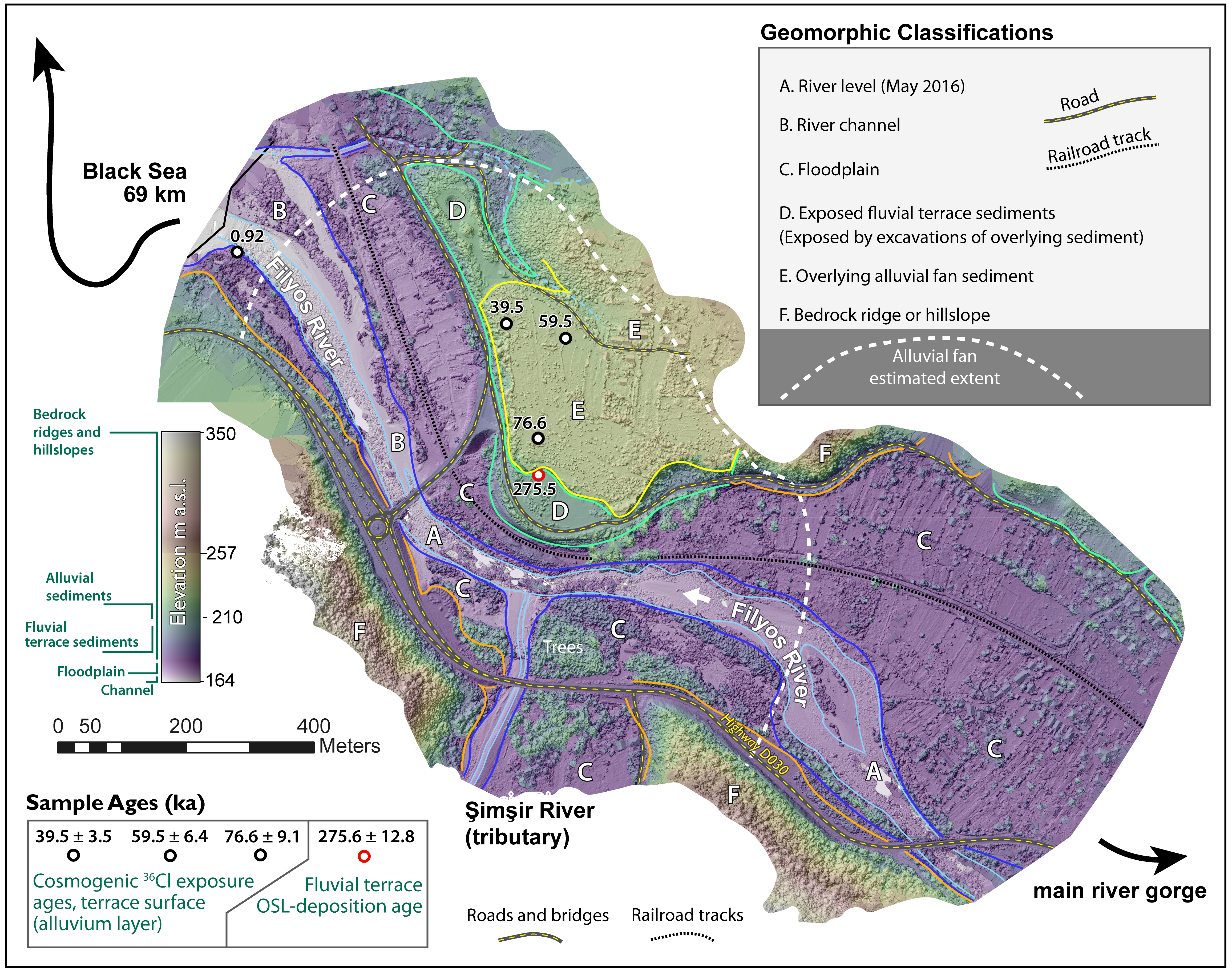 Digital surface model (DSM) produced at the confluence of the Filyos (main) and Şimşir (tributary) rivers, showing the junction terrace (T3) location and the classification of different surface features that were confirmed based on elevation and field observations. A remnant of the valley infill is preserved where labeled 'D.' While most of it eroded where there are now broad floodplains, a 1 km² tributary junction alluvial fan is proposed to have formed downstream (north) of the tributary canyon (Şeker Canyon) and in the main river valley. The layers from this fan are preserved where the letter 'E' is marked. Sample ages of the fluvial terrace and the overlying alluvial fan layer are in the lower left and sample locations are on the map. The channel sample in the western margin of the DSM is the inheritance correction boulder, with an age of 0.92 ± 0.1 ka.