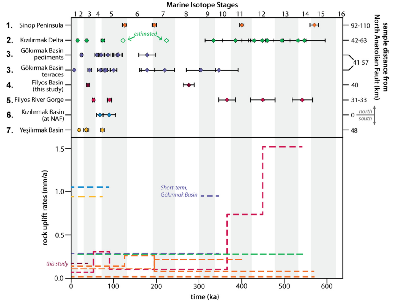 (Top) Landform ages from different rock uplift rate studies throughout the Central Pontides. Each number corresponds to locations in Fig. 1 and are arranged by distance from the North Anatolian Fault with number 6 located at the fault. (1.) Sinop Peninsula marine terrace ages from Yıldırım et al. (2013a). (2.) Kızılırmak Delta strath terrace, fill terrace, and delta terrace ages from Berndt et al. (2018). (3.) Gökırmak Basin strath terrace and pediment surface ages from Yıldırım et al. (2013b). (4.) Filyos River main river fill terrace and tributary junction alluvial fan ages of this study. (5.) Filyos River Gorge strath terrace ages upstream from this study from McClain et al. (2020). (6.) Kızılırmak River Valley fill terrace ages at the North Anatolian Fault in Hubert-Ferrari et al. (2019). Yeşilırmak Valley fluvial terrace ages south of the North Anatolian Fault from Erturaç and Kıyak (2017). (Bottom) Rock uplift rates through time at each study area. Colors correspond to the top section and the map in Fig. 1. The Gökırmak Basin has a long-term uplift rate reported as 0.28 mm/a and illustrated in the chart (Yıldırım et al., 2013b). However, a higher short-term uplift rate is seen in MIS 9 and is comparable in magnitude to other studies. It is also illustrated in the chart. The Sinop Peninsula reported rock uplift rates at three locations and therefore has three orange lines representing rock uplift rates in this chart (Yıldırım et al., 2013a). MIS stage boundaries are based on Lisiecki and Raymo (2005).