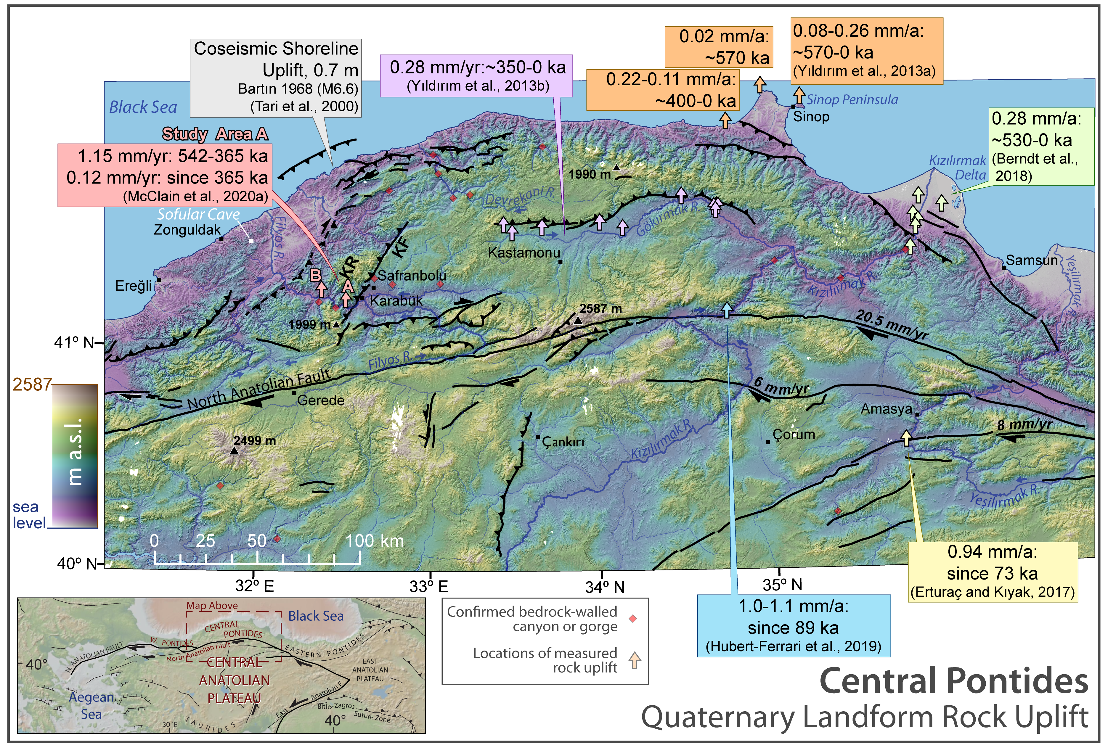 Topographic map of the Central Pontides at the northern margin of the Central Anatolian Plateau. The study area is located on the hanging wall of the Karabük (reverse) Fault, which is under transpression from the ~250 km-long restraining bend of the North Anatolian Fault. The main river of the study (Filyos River) flows along the North Anatolian Fault before turning west and northwest, where it bisects the Karabük Range en route to the Black Sea. Previous rock uplift rates studies of the transpressional Central Pontides are depicted in captions, with sample locations at arrows. Red diamonds mark locations of major bedrock-walled canyons or gorges. However, these are not comprehensive due to the possibility of minor canyons in less accessible tributaries. Faults are illustrated with slip rates when known. A map of the study area is seen in Fig. 2 (white box). Topography and hillshade were generated from the Advanced Land Observation System (ALOS) 2 Digital Surface Model (2014). KF = Karabük Fault, KR = Karabük Range.
